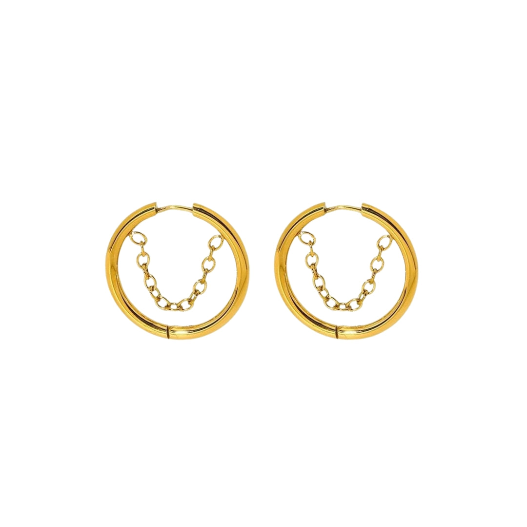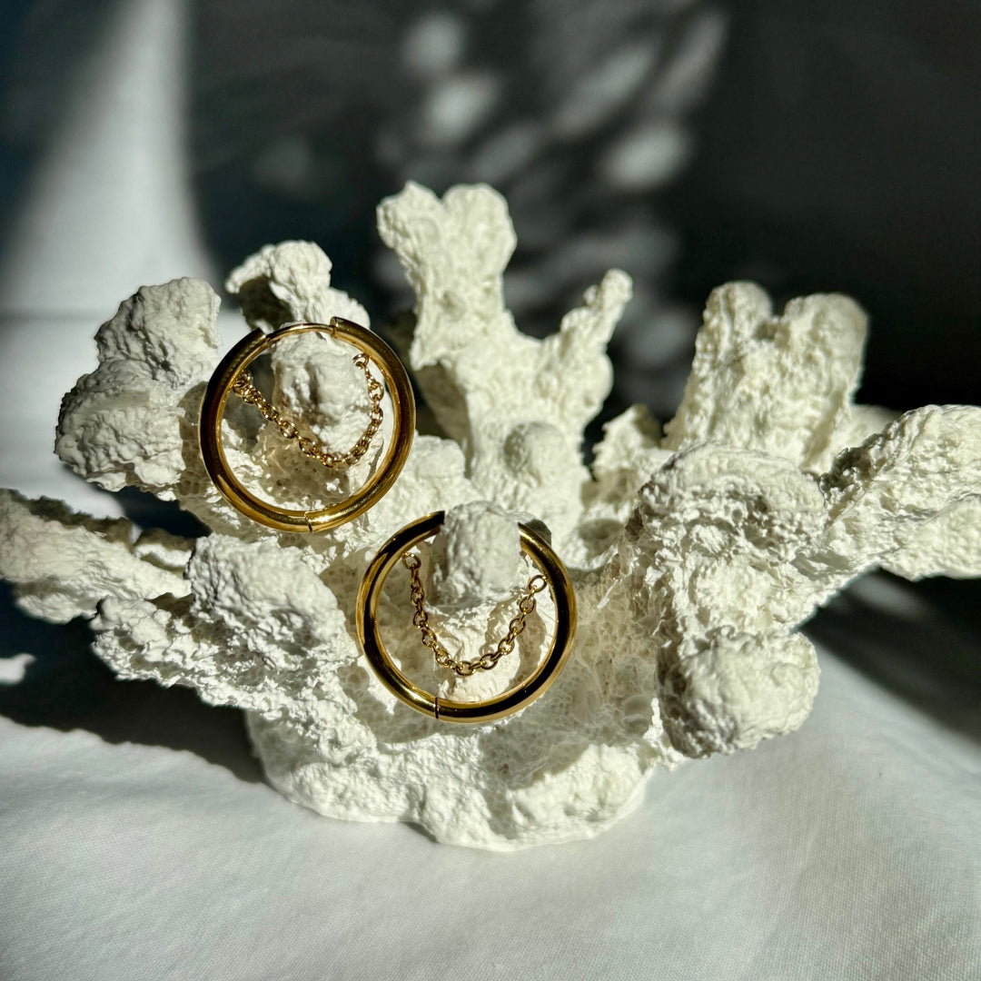 Oorbellen Loya zijn tijdloze ringen met een speels kettinkje. Dit maakt het net even anders. Gemaakt van stainless steel, dus hij verkleurt niet (ook niet als je ermee doucht of in de zon zit).